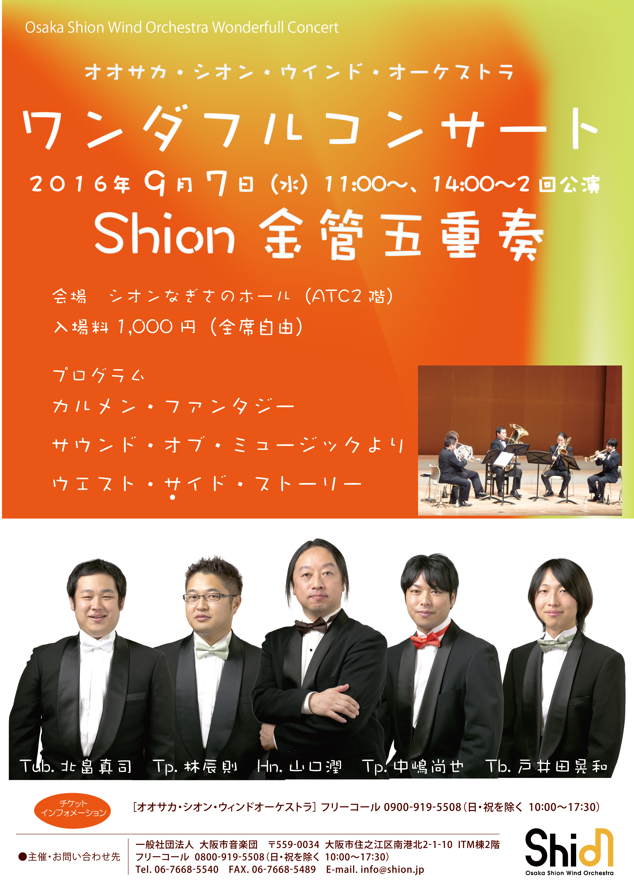 Osaka Shion Wind Orchestra(オオサカ・シオン・ウインド・オーケストラ)の金管五重奏が2016年9月7日に「ワンダフルコンサート」を開催