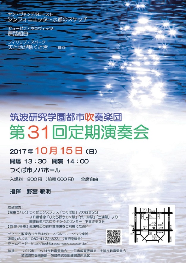 筑波研究学園都市吹奏楽団は、10月15日(日)茨城県つくば市ノバホールにて、第31回定期演奏会を開催する。