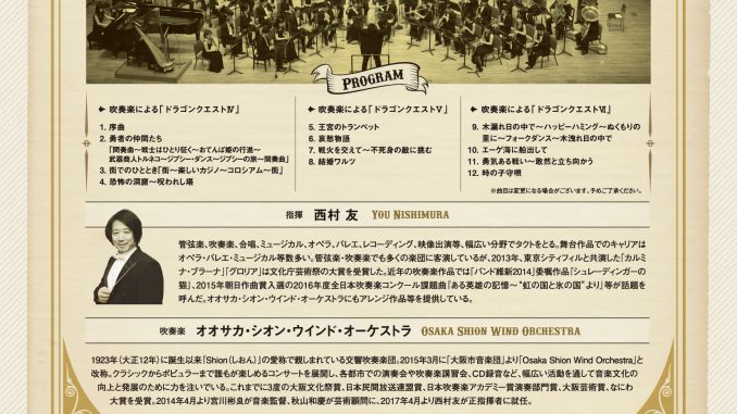 ドラゴンクエストの“天空三部作”である『ドラゴンクエスト IV、V、VI』の楽曲を、1923年の誕生以来“Shion(シオン)”の愛称で市民の楽団として親しまれている交響吹奏楽団、Osaka Shion Wind Orchestra(オオサカ・シオン・ウインド・オーケストラ)による演奏で楽しめるコンサートが開催される。